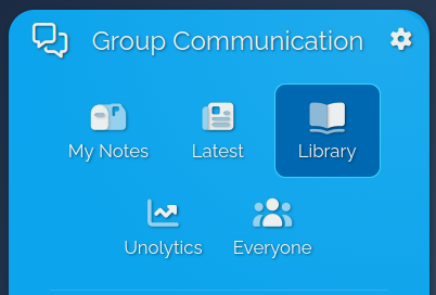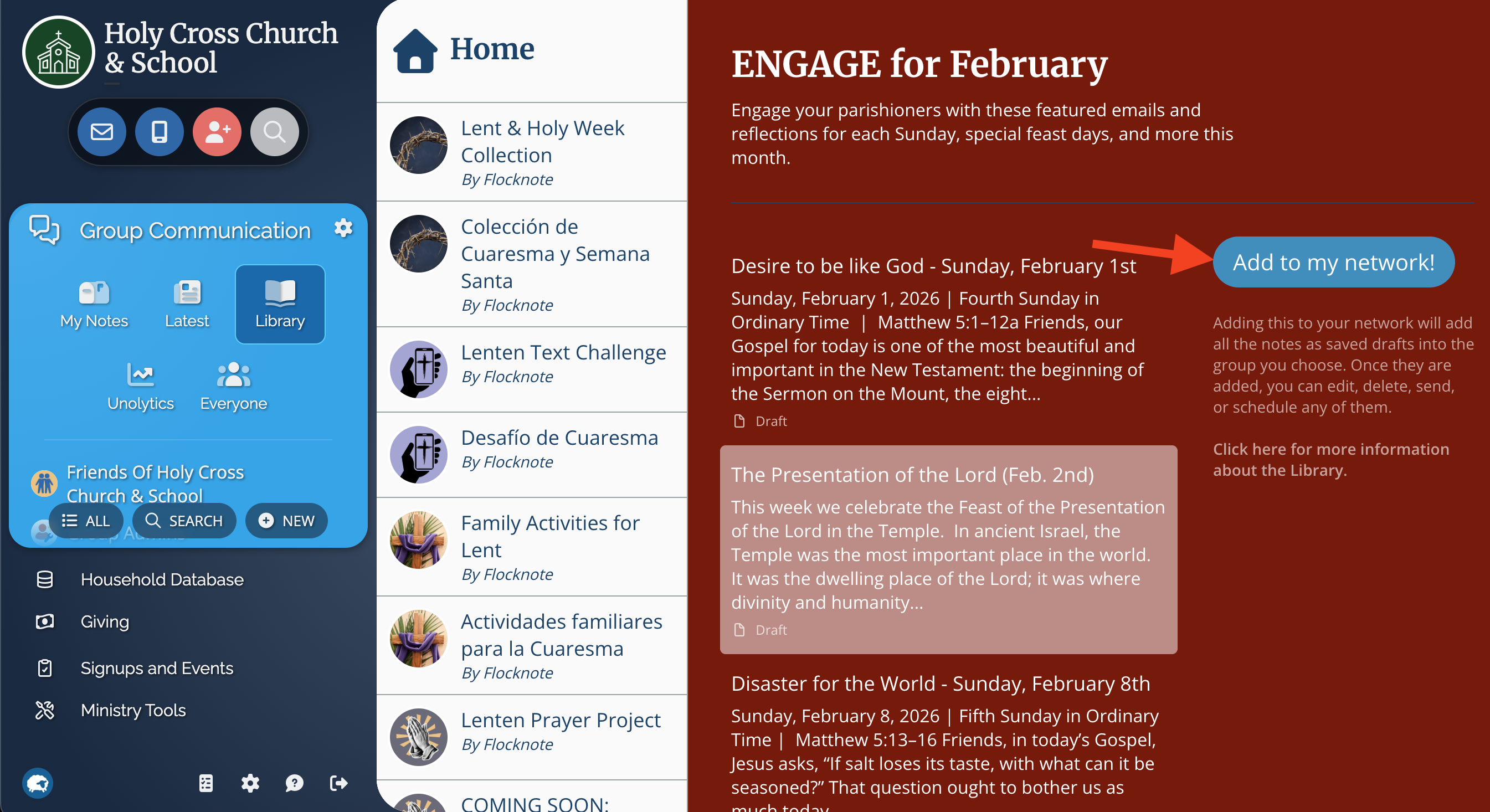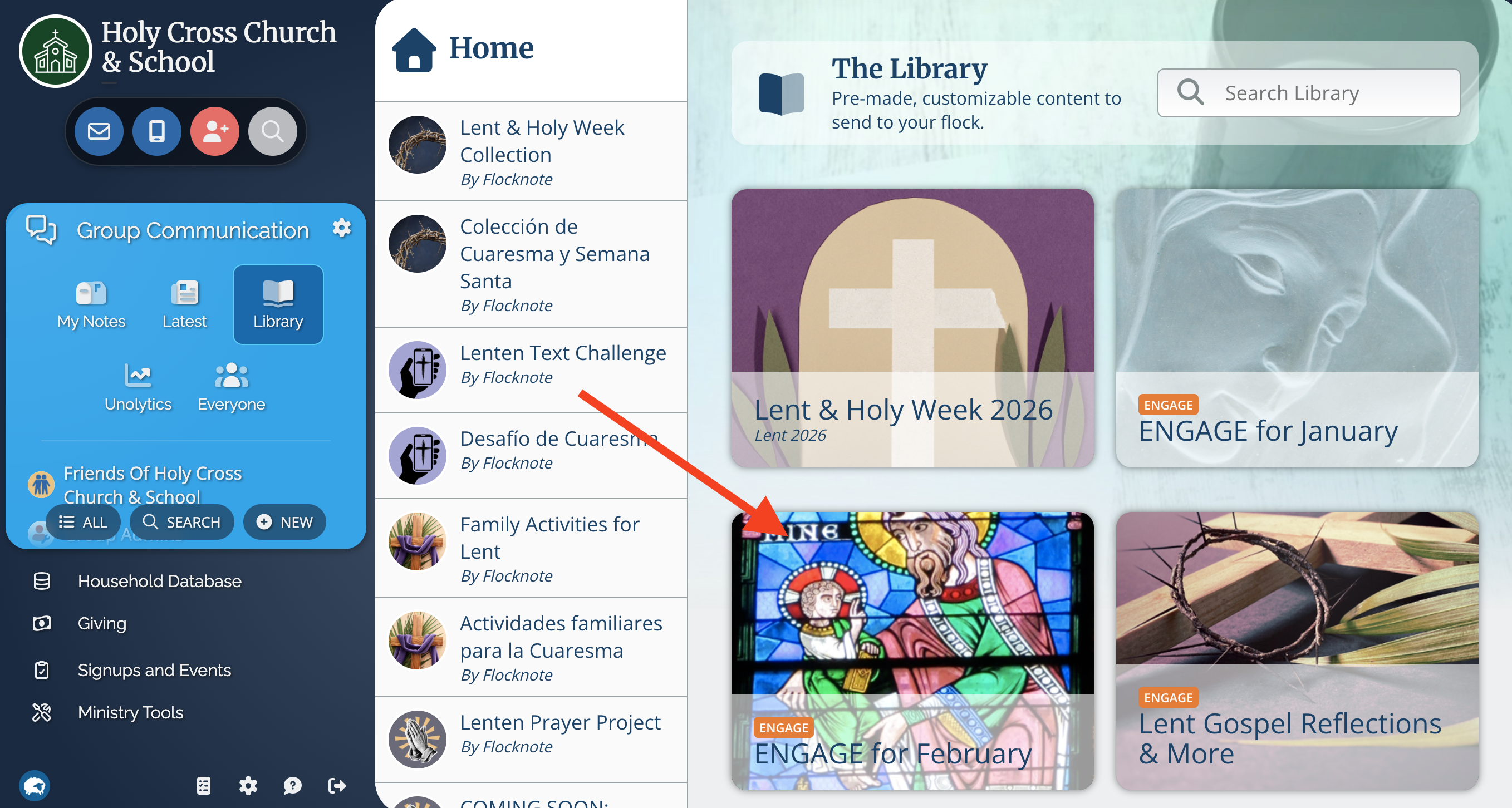 After logging in to Flocknote, on the left, open Group Communication, then click on the Library icon. This will open the Library, where all Word on Fire content will be stored for you.