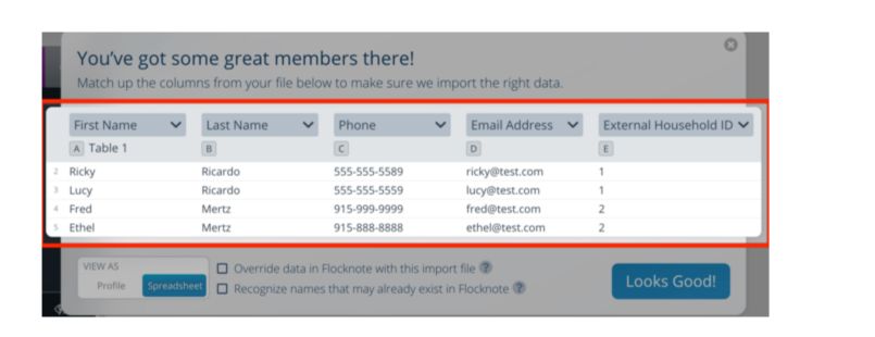 You can organize and bulk import households by an External Household ID that you assign. When importing, please be sure to note this ID # as a separate column. The "head of household" defaults to whoever is on the spreadsheet first for each household. For example, Ricky, Fred, and Carolyn would be the heads of their households based on the spreadsheet below
