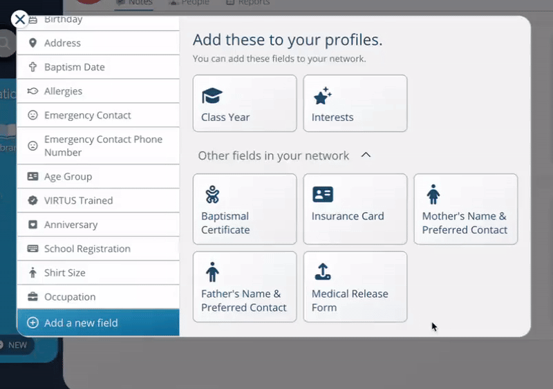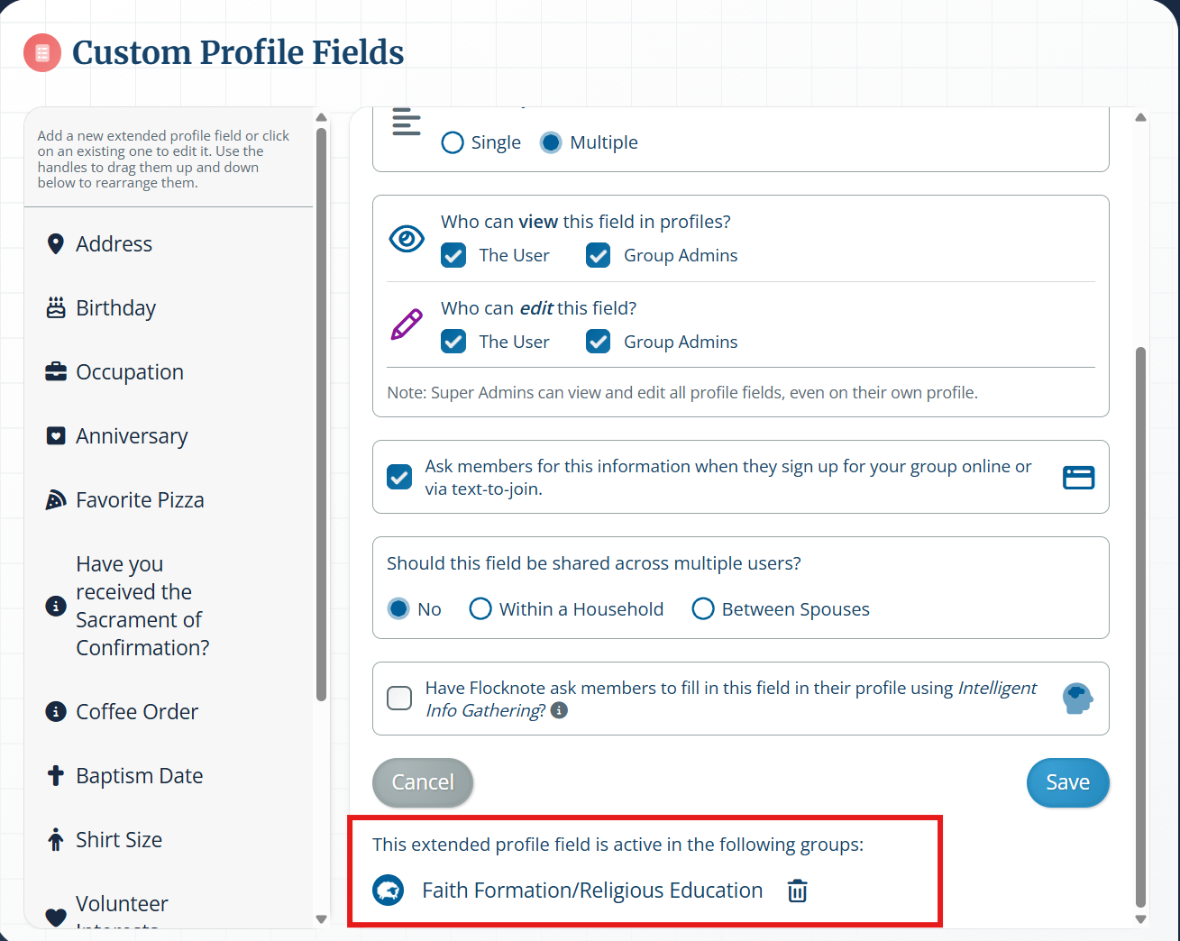 When adding a new profile field like "Ministry Interest", for example, you can scroll down the menu to view the other groups where "Ministry Interest" is included.