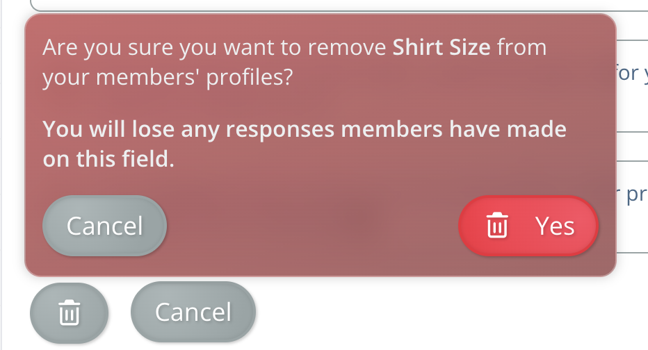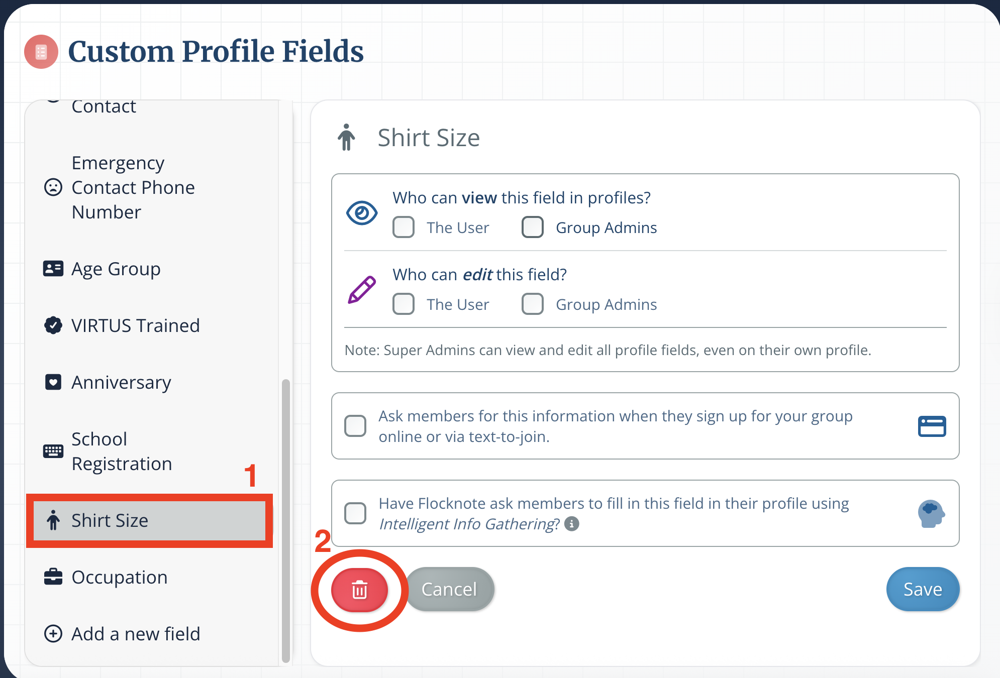 Next, click on the field you would like to delete from the left-hand side. In this case, we want to remove the "Shirt Size" Profile Field. Once the field is selected, click the red trashcan icon (see below).