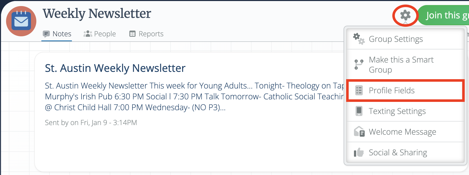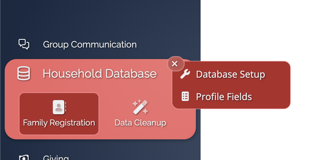 - Head to the Household Database tab under Group Communications, then click the white cogwheel in the upper right-hand corner and choose Profile Fields.