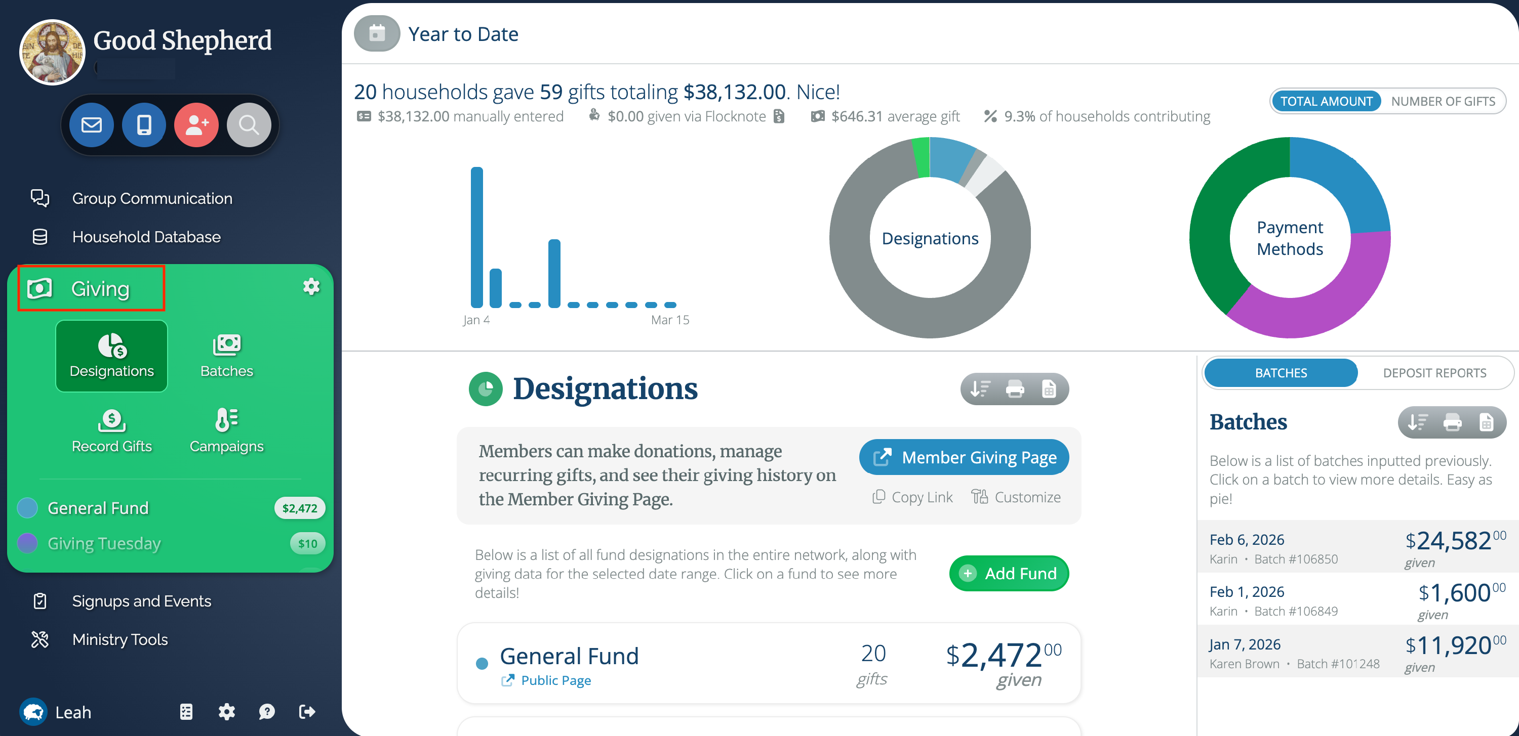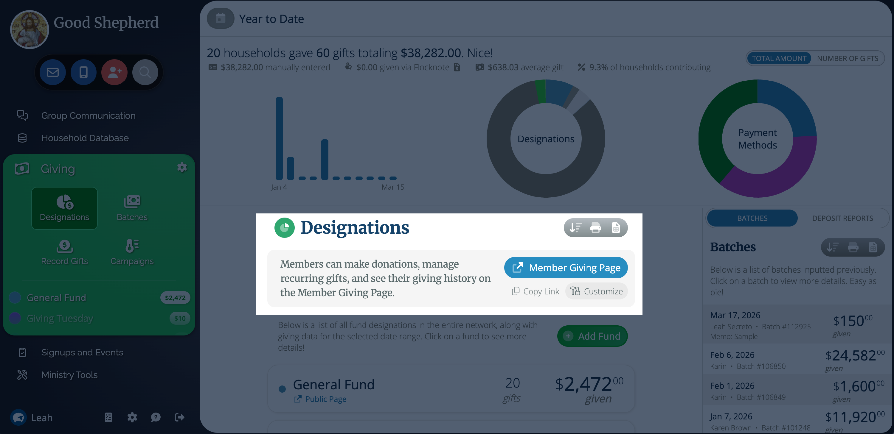 View the number of gifts and dollar amounts given by fund name and then click on each fund to see more detailed info, like individual households, the amounts given each day, and which payment method they used. You can also make Fund Settings changes, as well as export and print reports on this page.