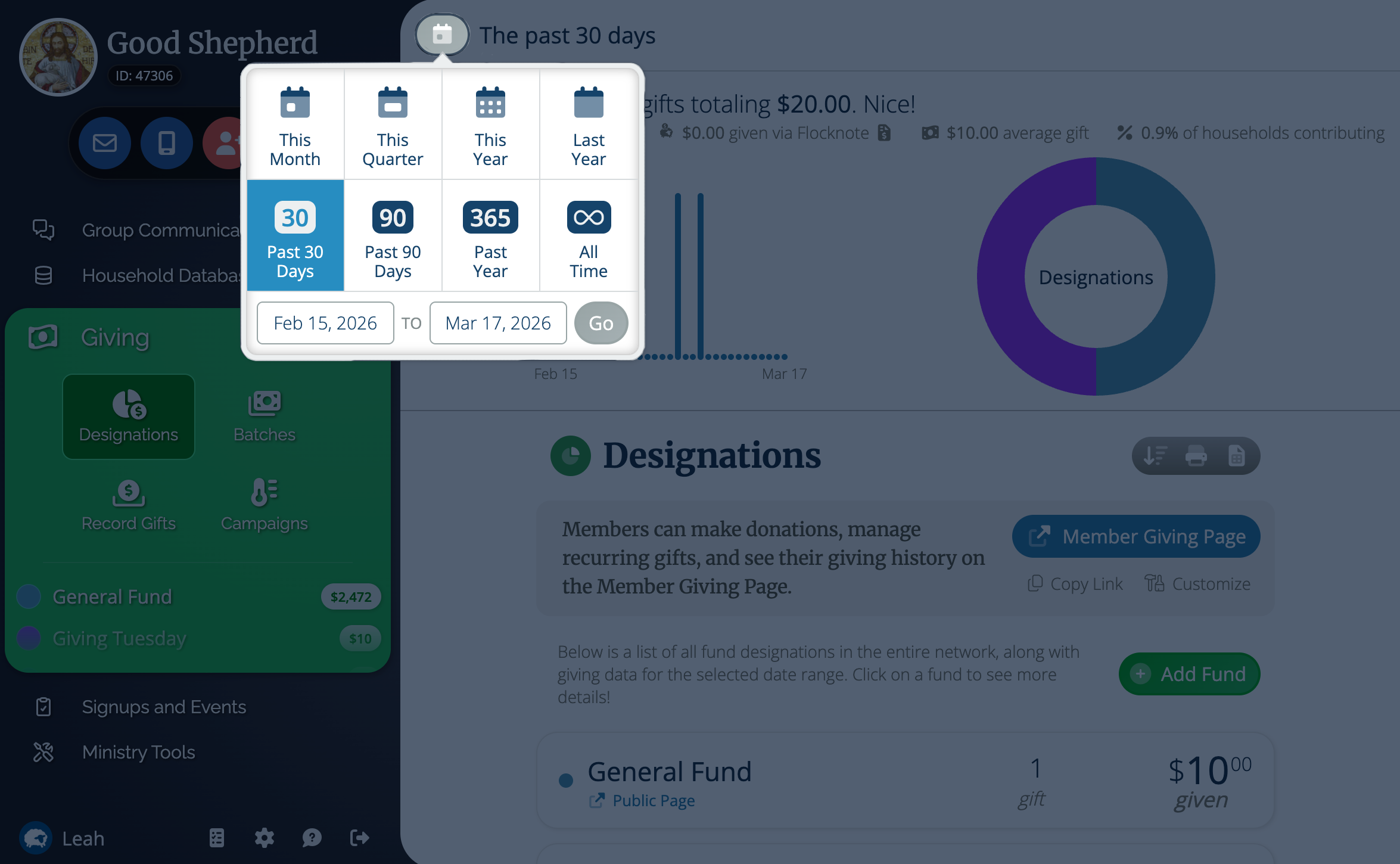 After selecting specific date ranges, you can filter the view by the number of gifts or the amount given. From there, you can break those stats down further by fund designation and payment method used.