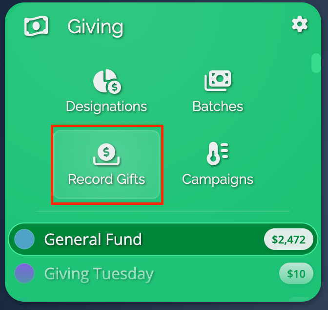 Flocknote Complete subscribers can record gifts given outside of Flocknote, either individually or in bulk batches, on this main Giving Tracking page.