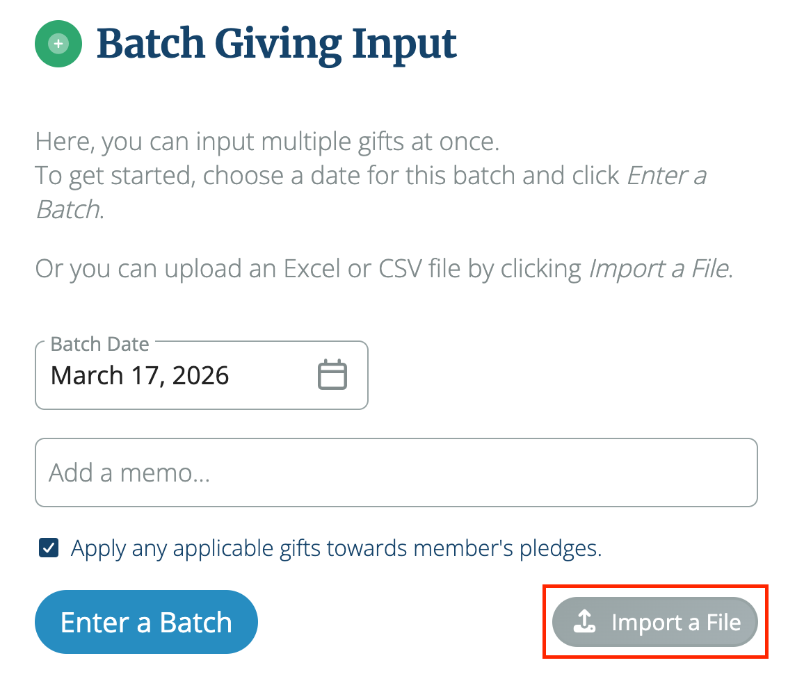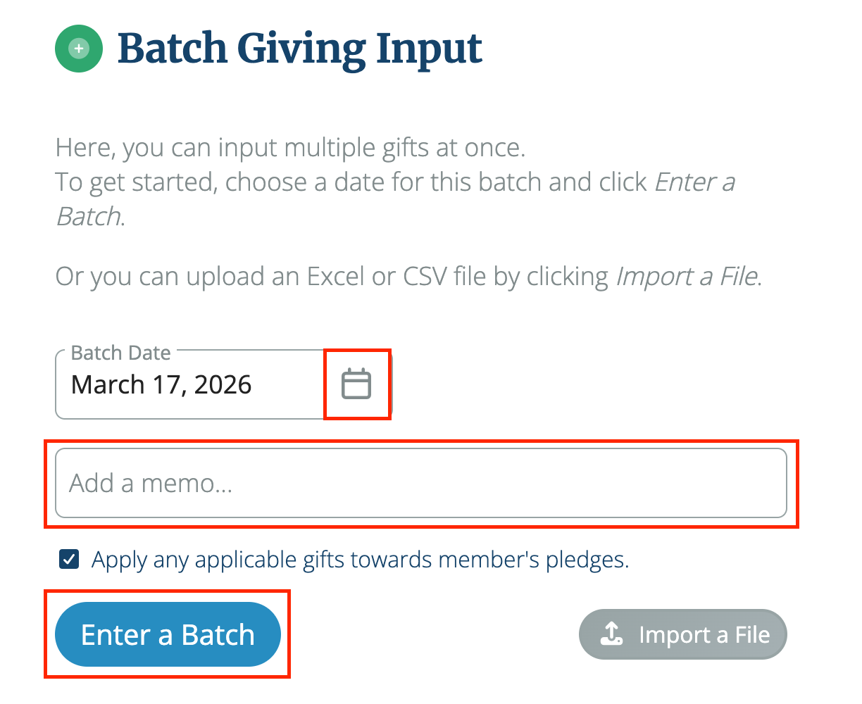 - If you are currently tracking pledges for any campaigns, you will have the option to check a box to apply any applicable gifts in this batch toward member pledges.