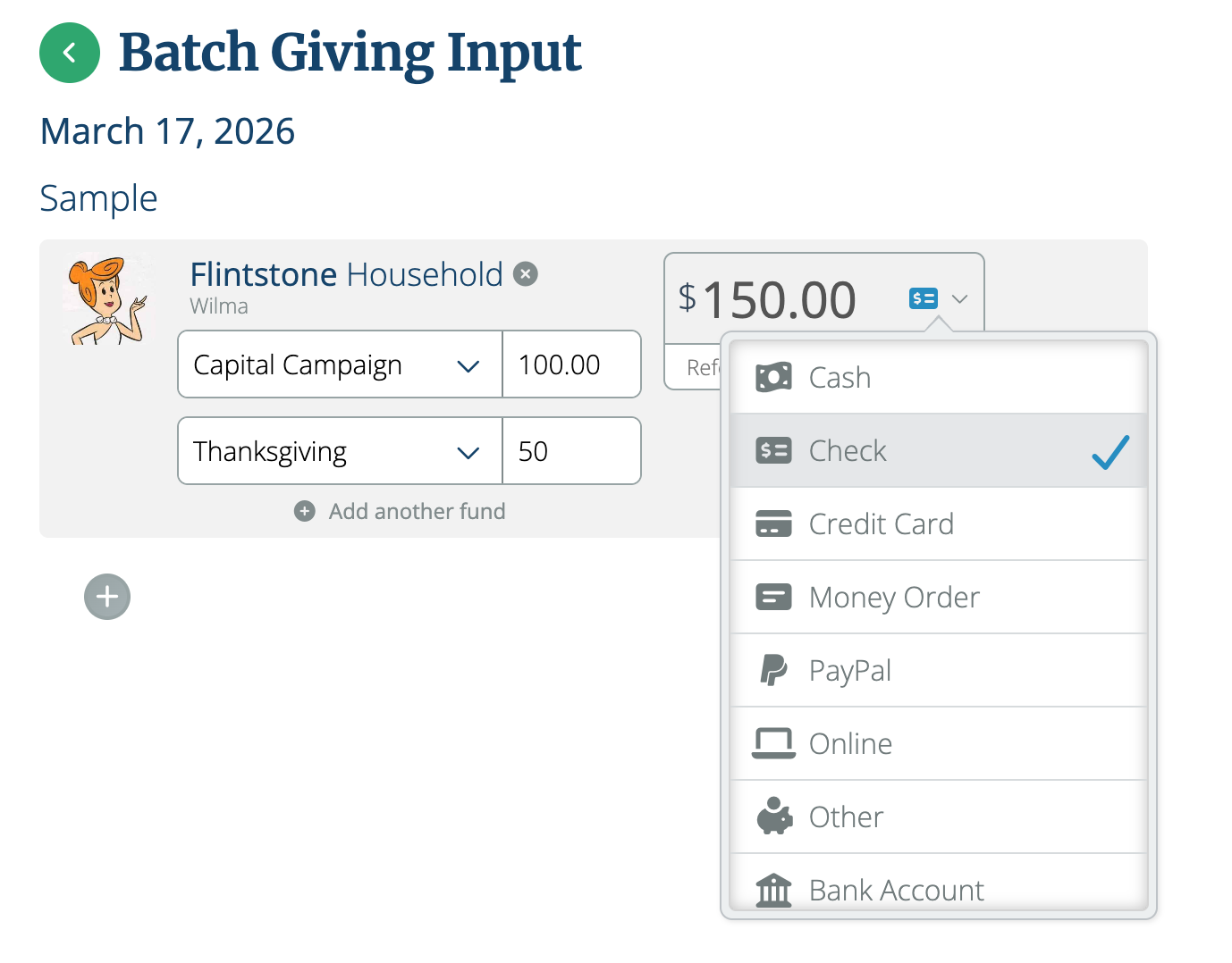 - Click the caret "v" icons to open up drop downs for selecting which fund the payment was made to and select which payment method was used. You can even split a payment between two funds by choosing to + Add another Fund and entering how much of the total payment should be allocated to each.