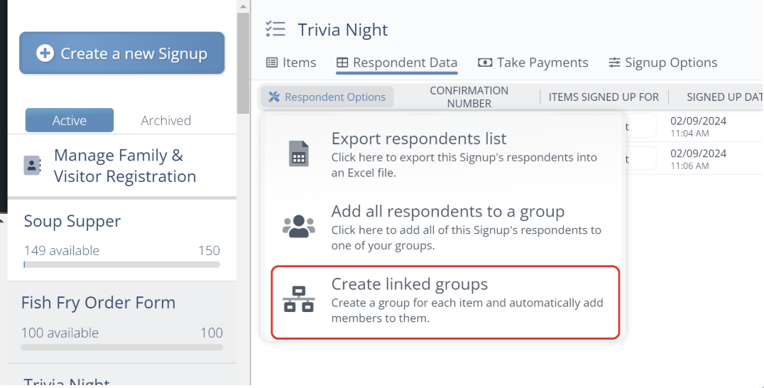 To create new linked groups, simply click Respondent Data at the top menu of your Signup. From there, you'll either have a list of three options or respondent data with the custom field info. If you see a button that says Respondent Options, click that and from there you can export respondents, add all respondents to an existing group, or create new linked groups. Select Create linked groups.