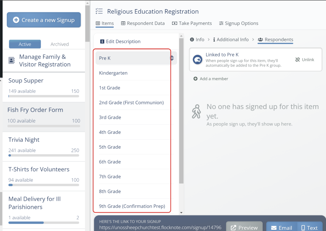 - Items — allow volunteers to sign up to bring a specific item. Great for potlucks and class parties! (When you enable online giving within Flocknote you can collect money for pizza or fish-frys, sell t-shirts, and more.)