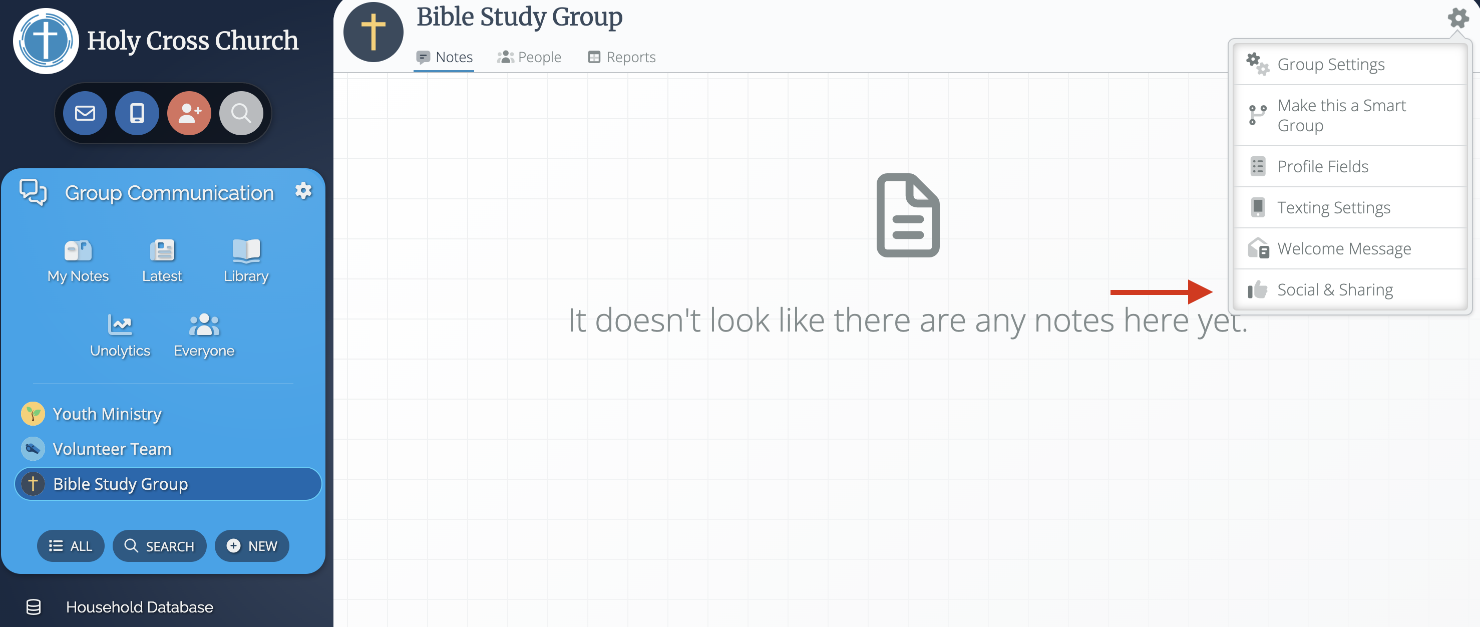 To find your RSS Feed link, select your group and click on the grey cogwheel at the top right of the page. This will open a list of settings you can adjust. Select Social & Sharing: