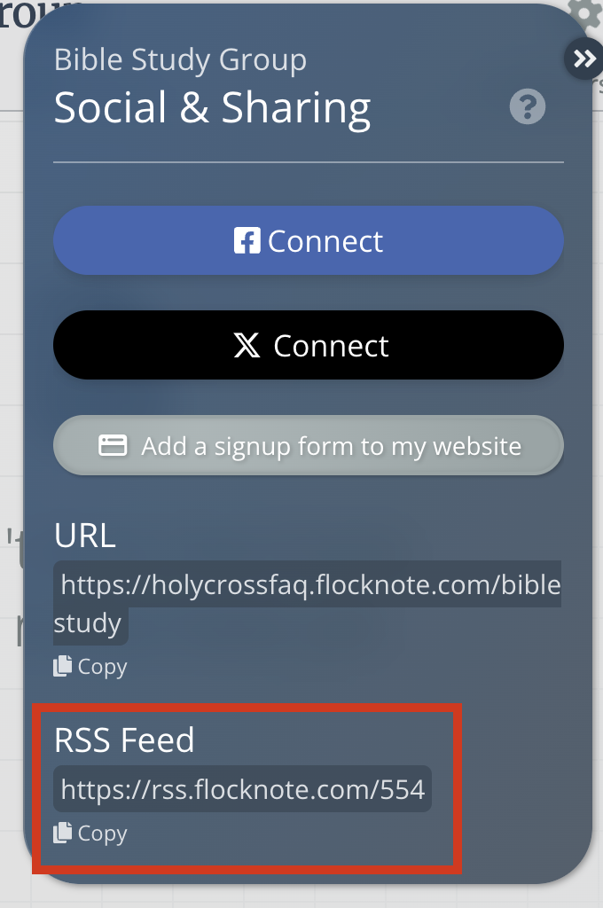 After selecting Social & Sharing, you'll see a menu with the RSS Feed link at the bottom. Click the Copy icon to copy the link: