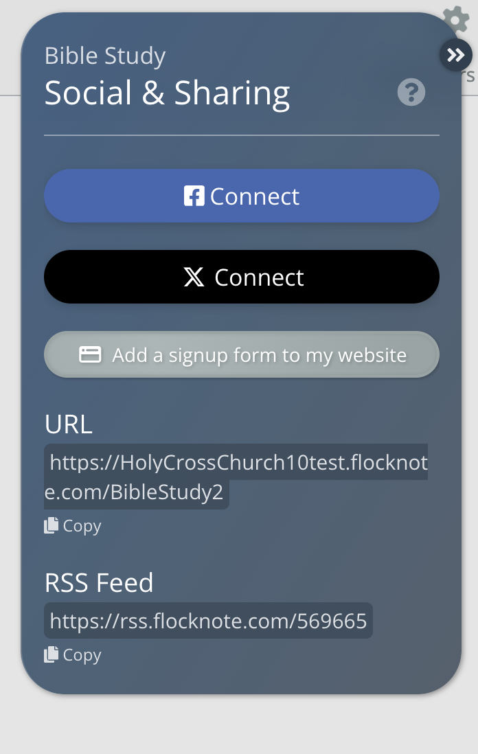 Within every group, you'll find a Social & Sharing section. This section includes options to link your church's Facebook or X profiles, get your network or group's public URL, tools to add a sign-up form to your website, RSS feed management, and more!