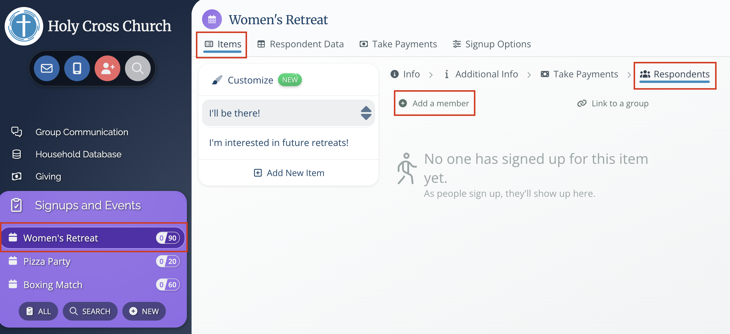 6. Search for the member you'd like to add in the pop-up window. Once the member is added, they will automatically appear under Respondents for that section, and they're successfully signed up for that item. 👍