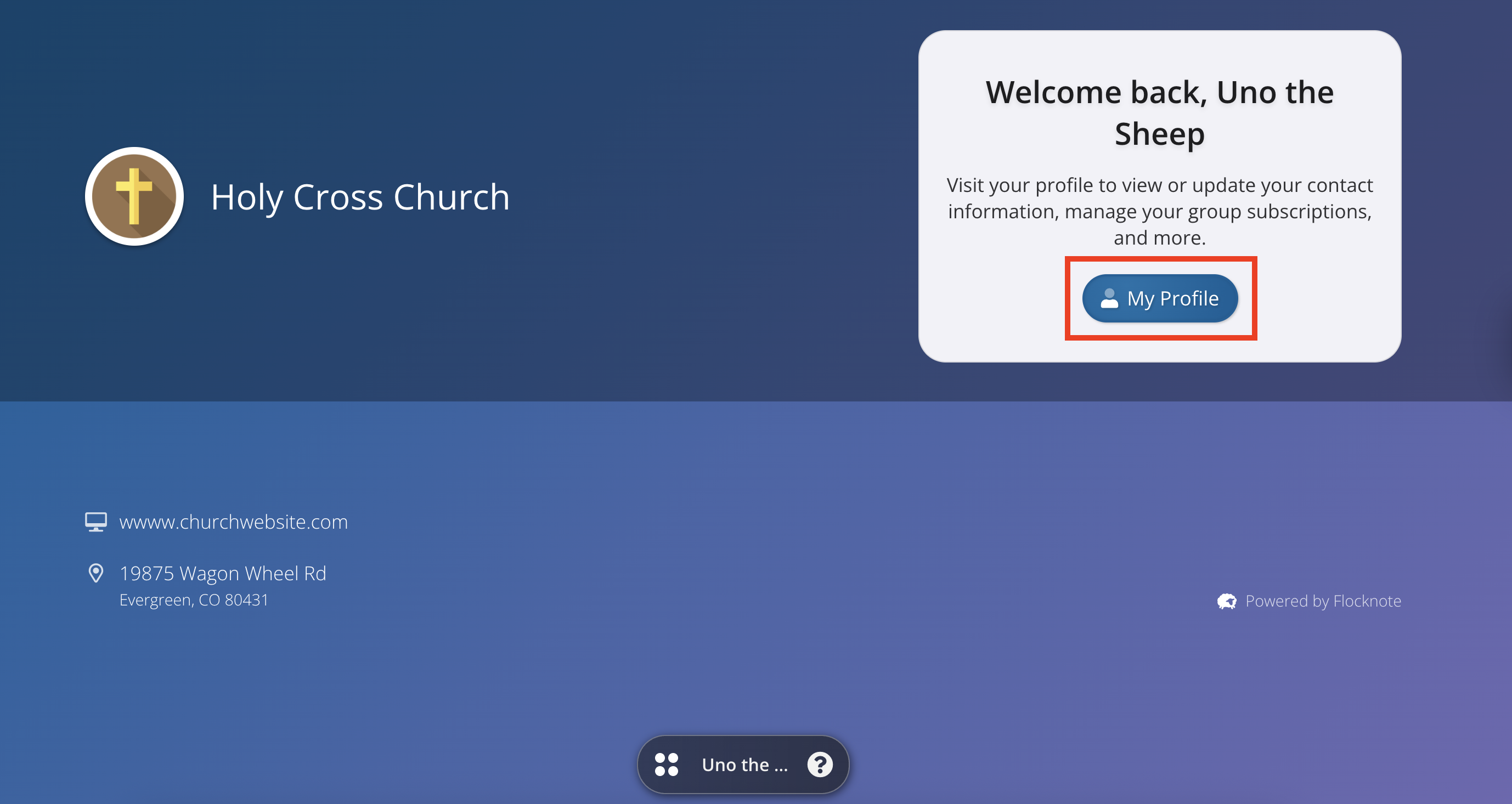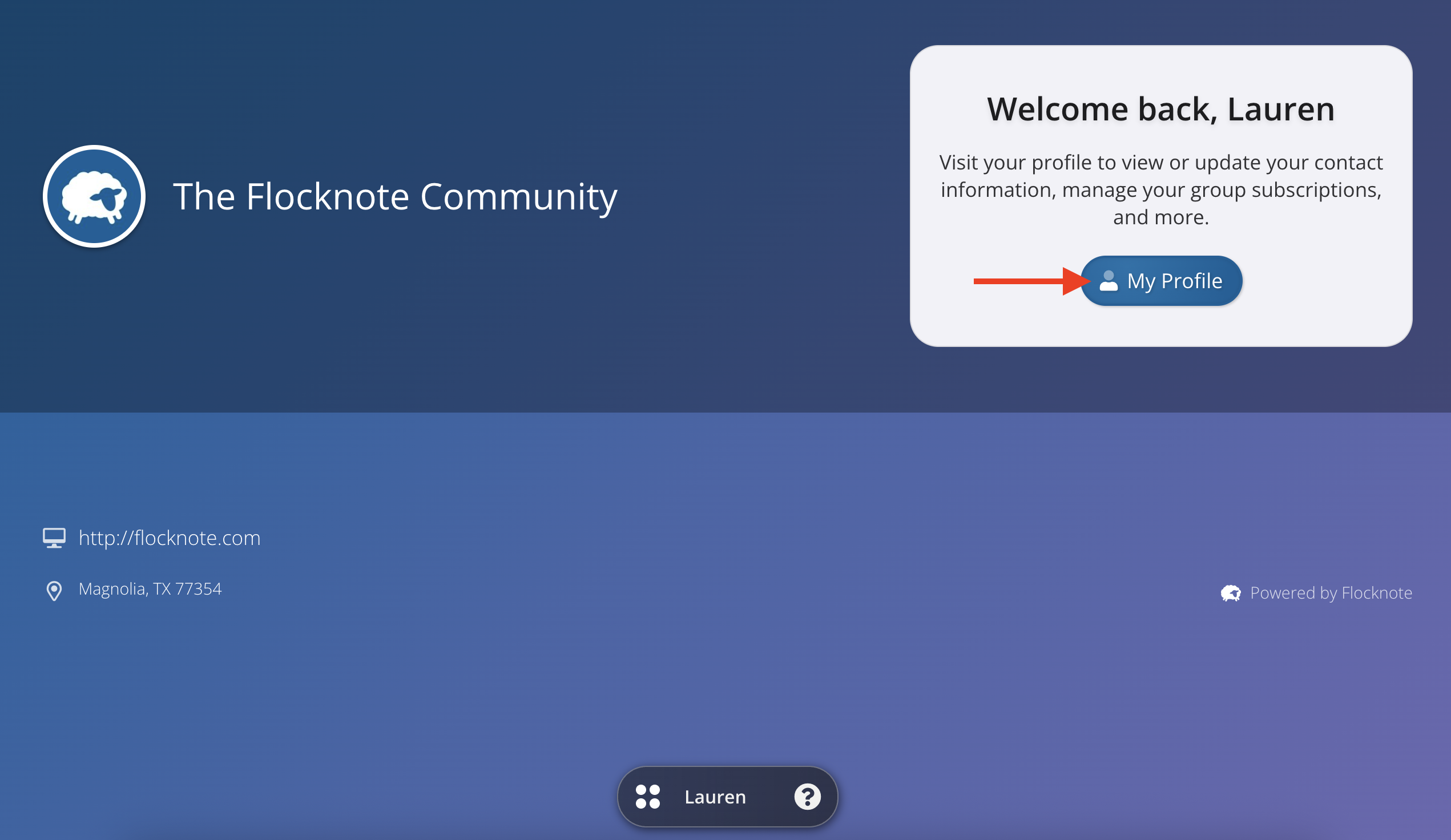 To start, log in to Flocknote. (Never logged in before? See the Related Articles section at the bottom of this page. When you arrive at the Flocknote homepage (see below), select the blue My Profile button.