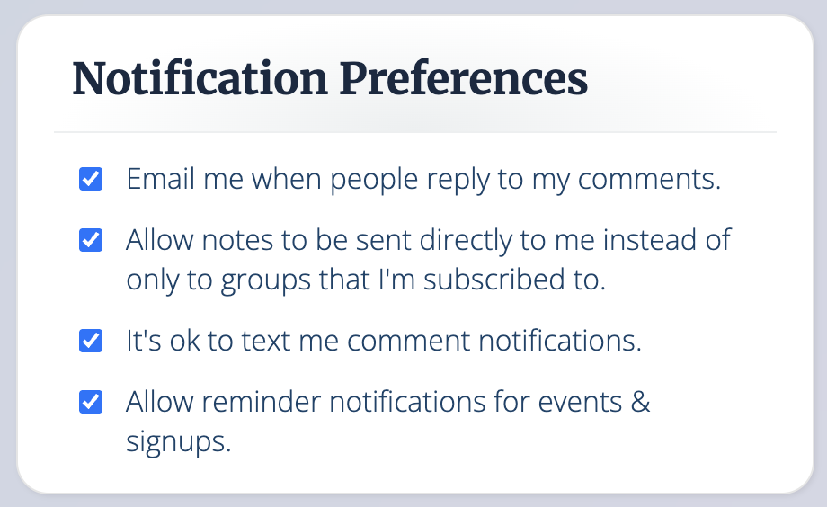 From there, select the Groups tab and click on the different icons depending on how you'd like to receive notes, comments, or leave a group. If the icon is blue, that means that notifications are turned ON. If the icon is grey, then notifications are turned OFF.