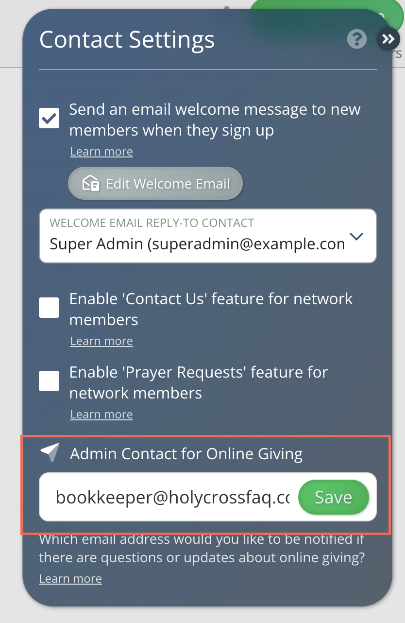 What emails does the Admin contact for Online Giving receive? How do I find/change the Admin Contact for Online Giving?