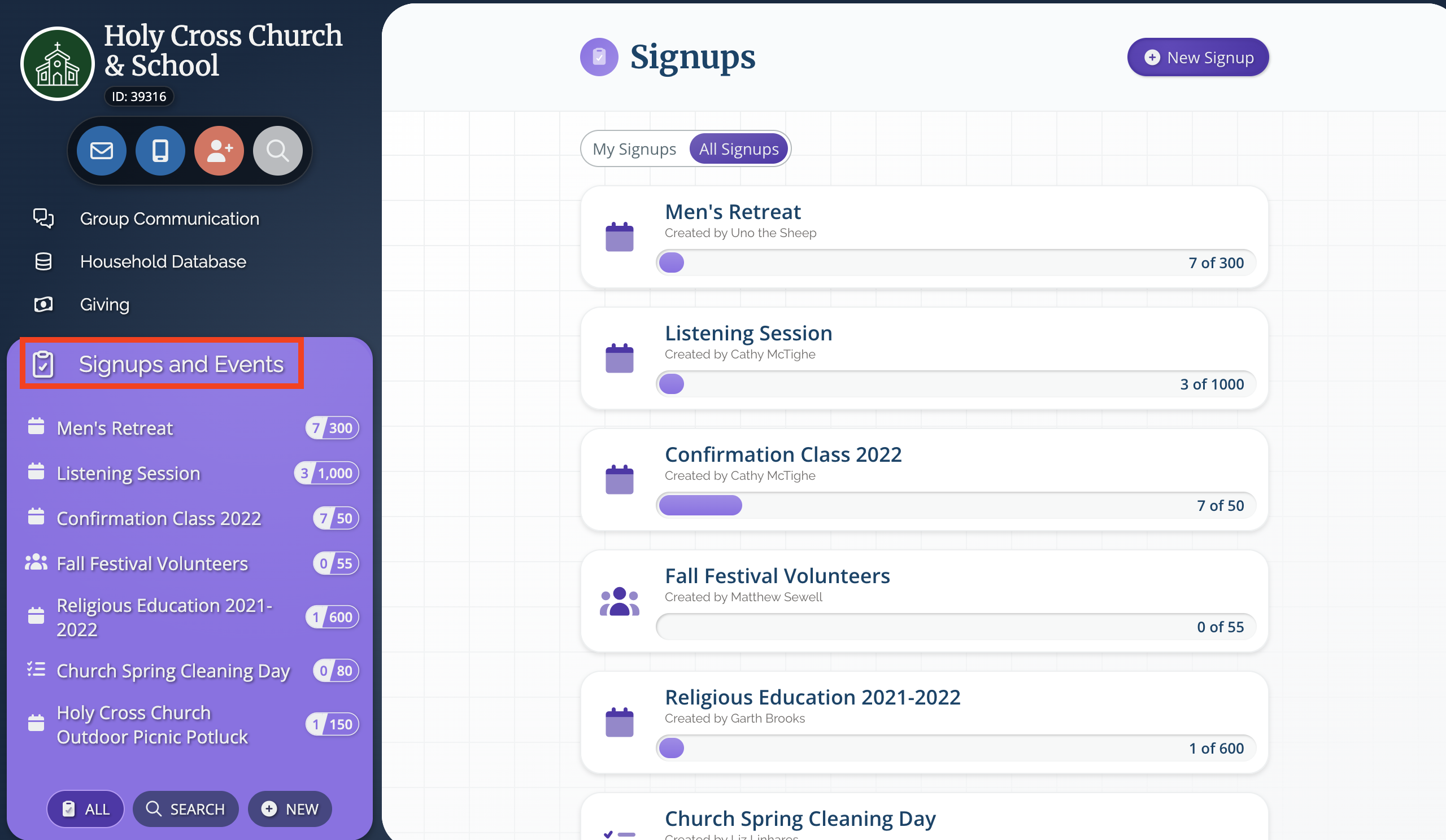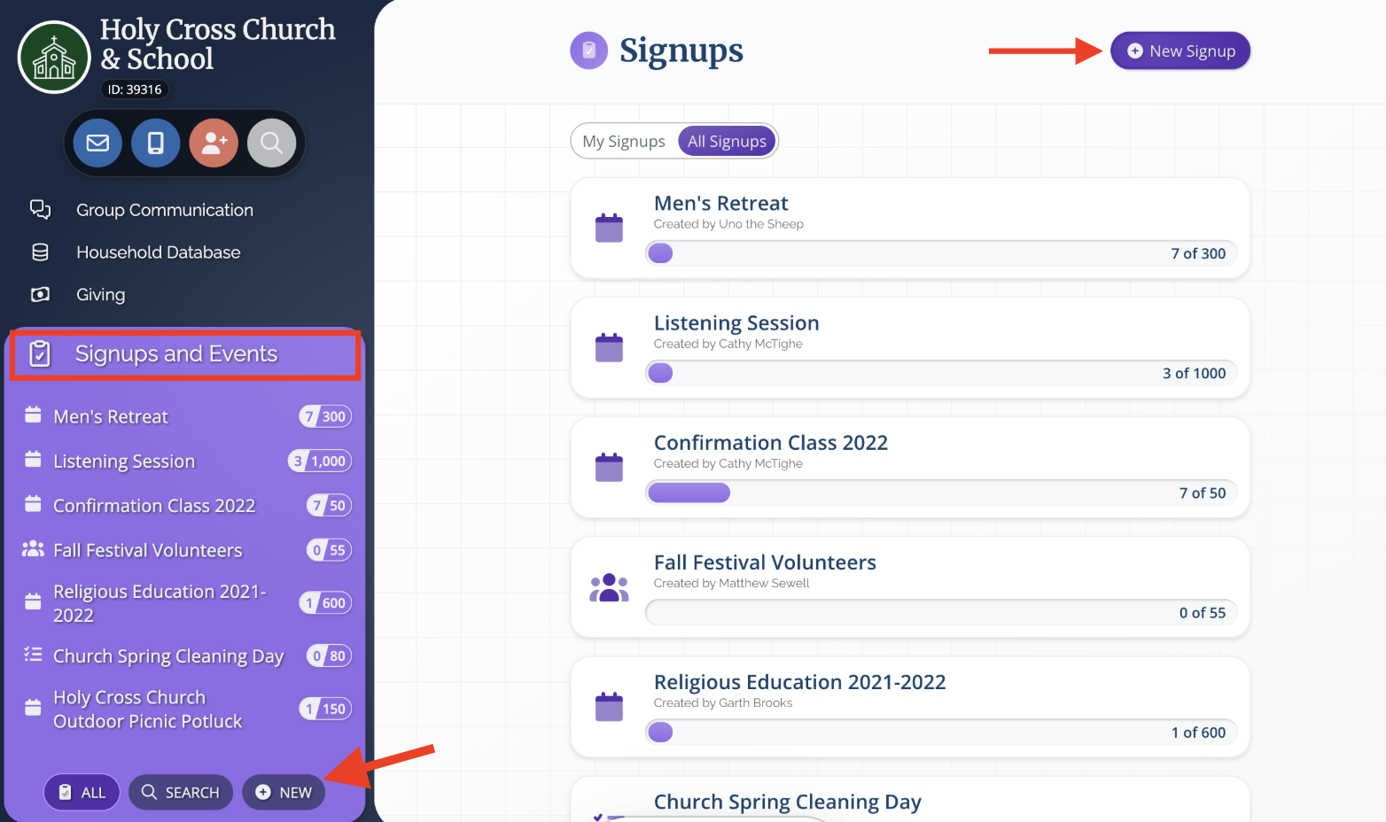 Create a new Signup from scratch by clicking on the Signups & Events tab on the left-hand side panel. Then select the purple + New button at the bottom of the pop-up or click the purple New Signup button at the top right-hand corner of the page to start building your Signup. For additional help creating a new Signup, check out this handy FAQ.