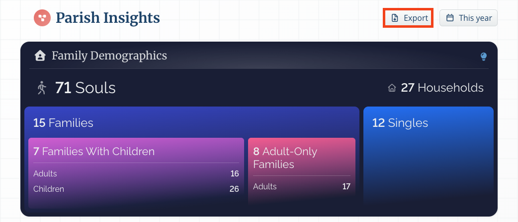 - Family Demographics lets you see the breakdown of all the unique souls in your church -- how many singles vs. families, how many families have kids vs. don't.