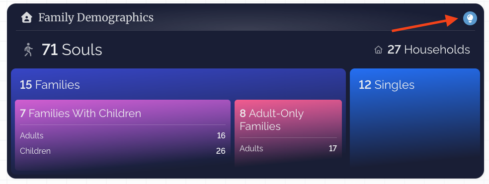 The data compiled in Insights comes from various places on your Parish’s/Church's Flocknote Network. Members who have a Household Status via Family & Visitor Registration (or manually added) are included in your insights. Click the light bulb (💡) icon to the right of each section to see where a particular data set originates.