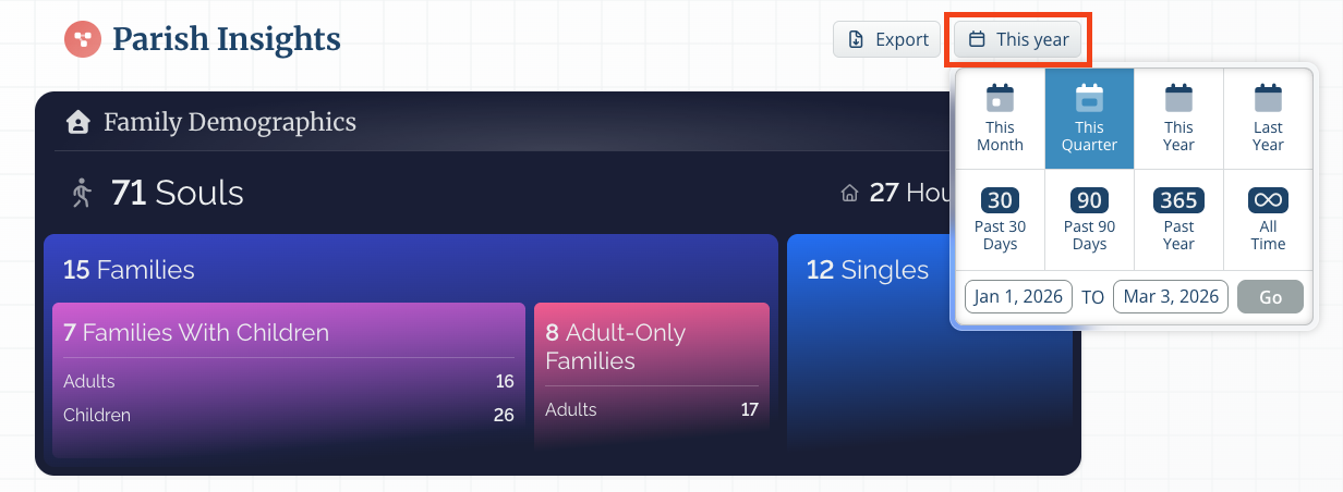 As for the Giving Summary and the Sacraments & Parish/Church Life statistics, you’re able to select a specific period for the data you would like to view. Select the Calendar icon at the top right of the page and select the period you would like to view. This will pull up the Giving, Sacrament, and Parish life statistics for that period.