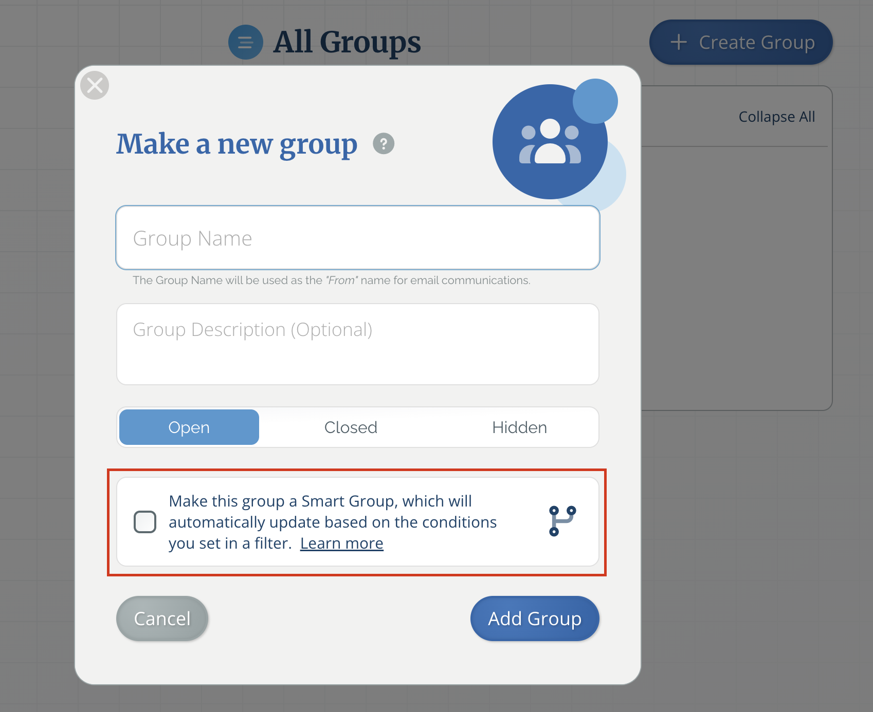 - Give your Smart Group a name, an optional description, and then label it as an open, closed, or hidden group.