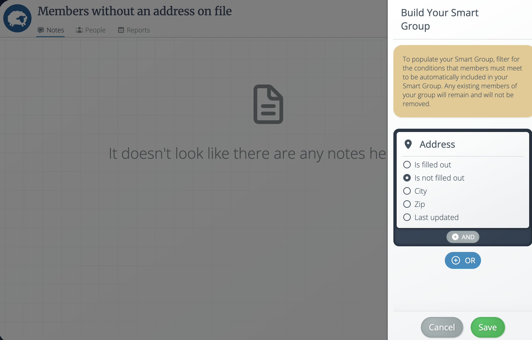 - Once you update the filters on the Smart Group, click the green Save button at the bottom of the screen and your filters will be reflected in the Smart Group. Those members who no longer meet the new criteria will automatically be removed.