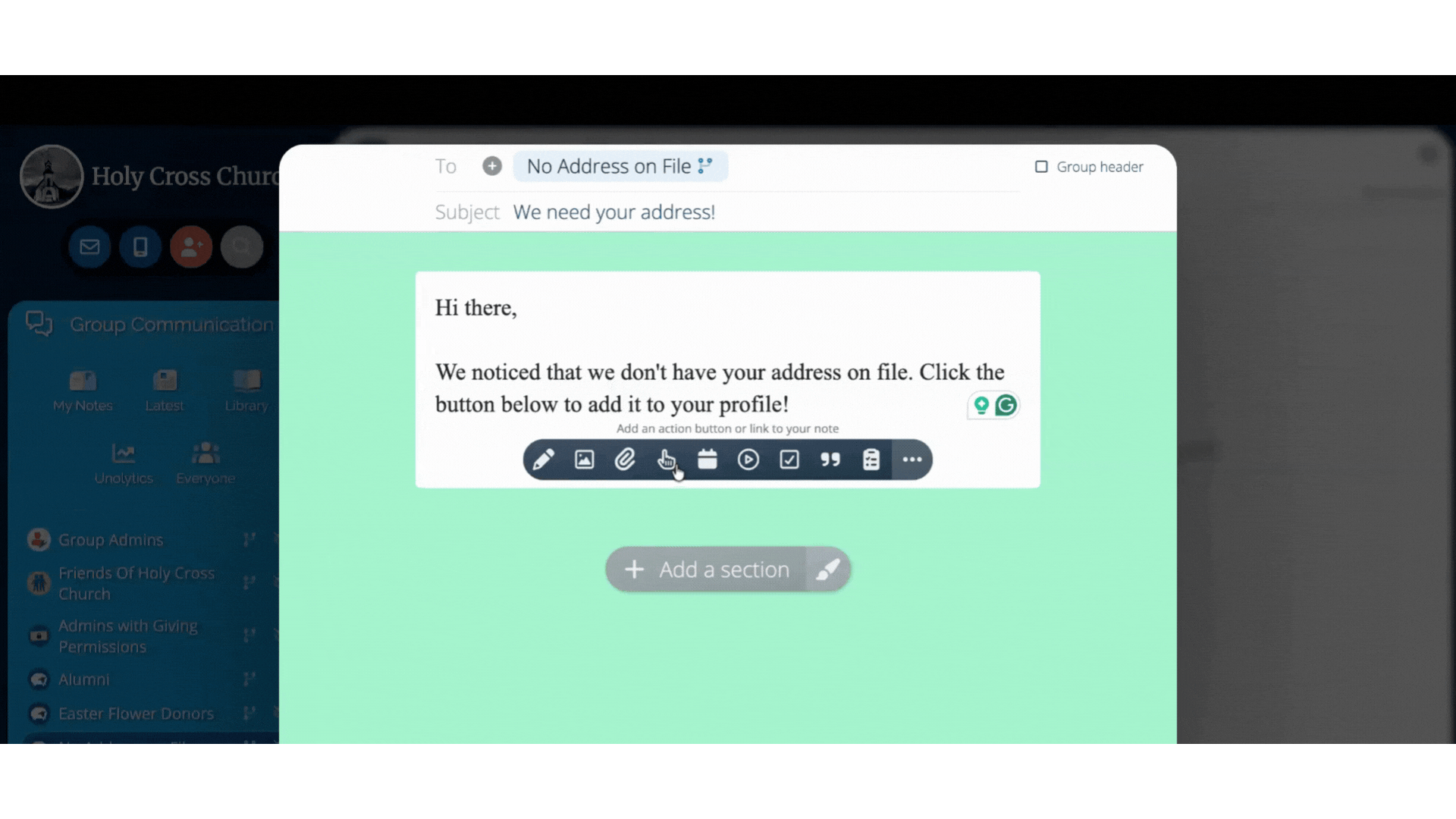 Sometimes your members join your network, and for whatever reason, they don't provide all of their info (like their full name or cell number). Or perhaps you've imported a list of contacts in the past, but now you need to add more information like their address, allergies, etc. Now with the Ask the Member tool, prompting members to update their info is easier than ever! Send pre-formatted/customizable messages to your members right from their profile. No more chasing members after church to get their latest information. 🎉