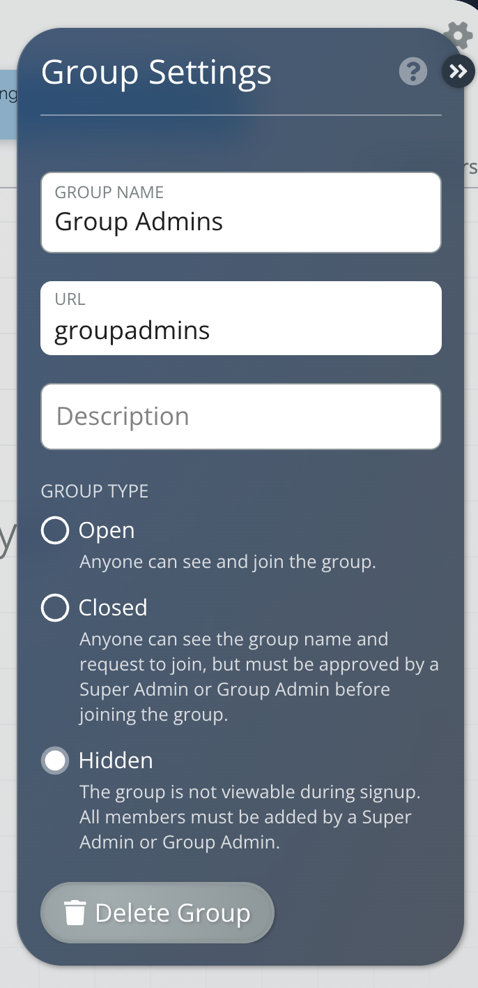 - Group Type β Choose whether you want to keep your group open (anyone can join), closed (requiring approval by a Group Admin or Super Admin), or hidden (only current members and Admins see). Learn more about group types with the articles at the bottom of the page.