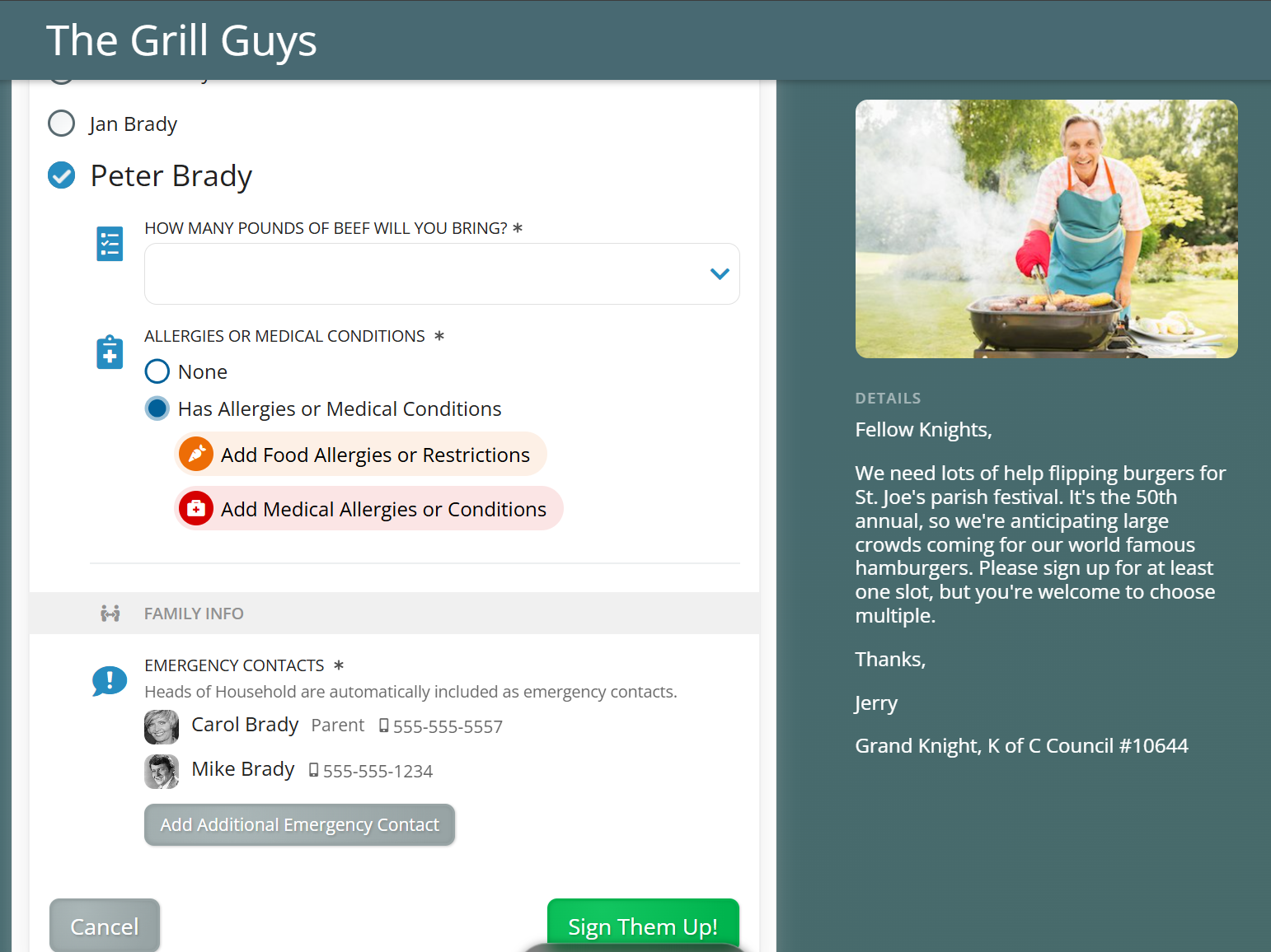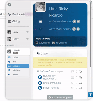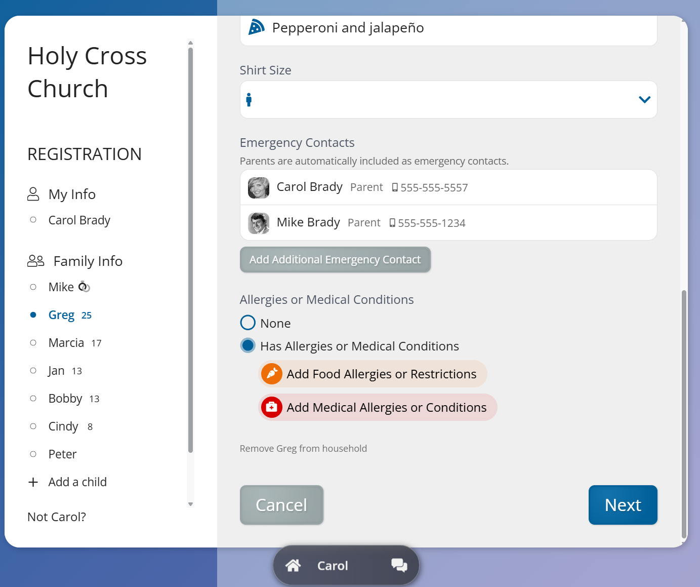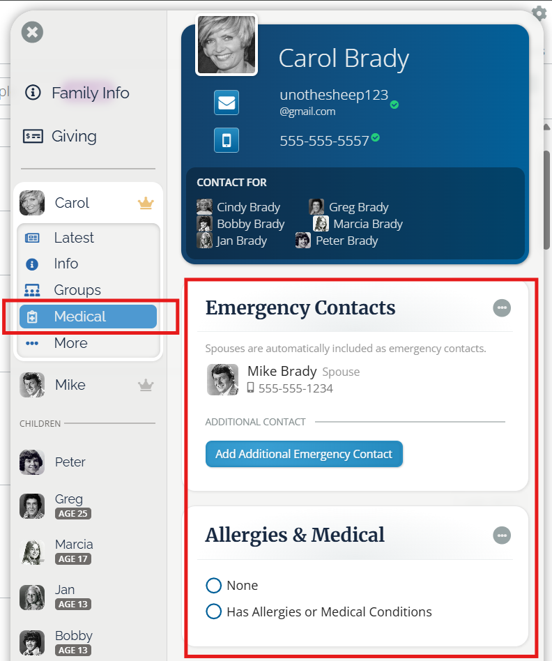 Whether you’re planning for a youth retreat, a church event, or simply want to update member information, you can do so with our Emergency Contacts and Allergies & Medical Conditions fields.