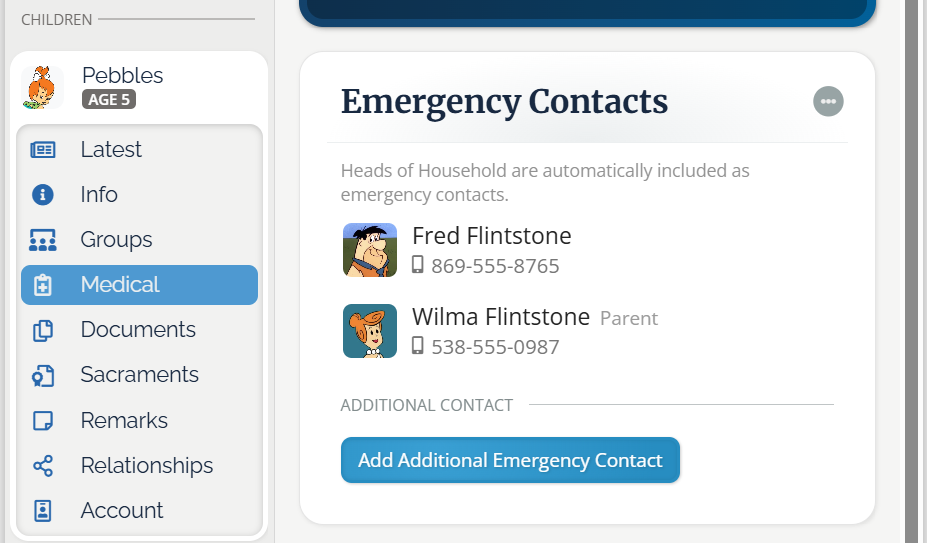 Heads of Household (and their spouses) are automatically set as Emergency Contacts for everyone in the household. Parents are also automatically listed as Emergency Contacts for all children.