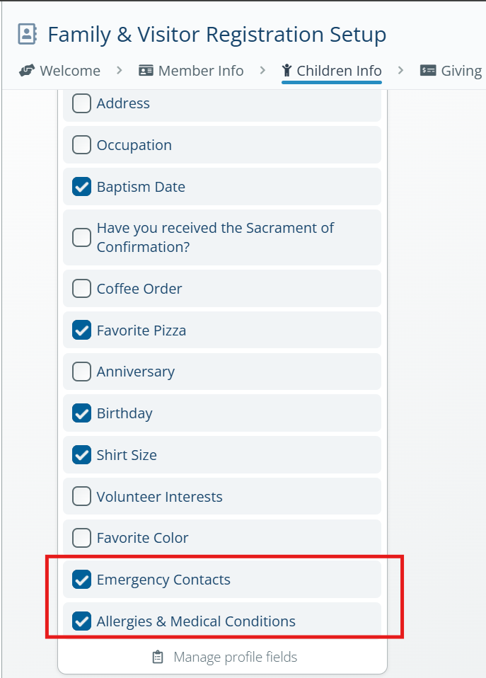- Select the profile fields: Emergency Contacts and Allergies & Medical Conditions