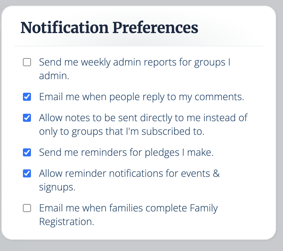 You can also log into Flocknote and adjust your notifications by selecting the purple bell icon. You can adjust your text and email notification settings for all your groups or completely remove yourself from a group. Please note that once this is done, you will no longer receive text messages or emails from that particular group. See more about adjusting notification settings here.